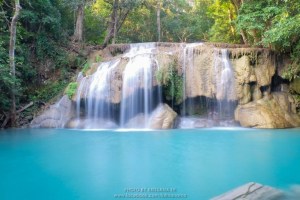น้ำตกเอราวัณ ตั้งอยู่ในเขตอุทยานแห่งชาติเอราวัณ ตำบลท่ากระดาน อำเภอศรีสวัสดิ์ จังหวัดกาญจนบุรี อยู่ห่างจากที่ทำการอุทยานประมาณ 500 เมตร มีความสูงจากระดับน้ำทะเลตั้งแต่ 100 – 400 เมตร แบ่งเป็นชั้นต่างๆ 7 ชั้น มีระยะทางจากชั้นล่างสุดขึ้นไปชั้นบนสุด 1500 เมตร ลำน้ำเมื่อตกลงมาแล้วจะไหลลงแม่น้ำแควใหญ่บริเวณที่ทำการอุทยาน เดิมน้ำตกนี้ชาวบ้านเรียกว่า น้ำตกสะด่องม่องลาย อันเป็นชื่อลำห้วยม่องลายที่เป็นต้นน้ำ โดยบริเวณน้ำตกจะมีน้ำตลอดปี แต่จะมีน้ำน้อยในช่วงฤดูแล้ง ราวเดือนธันวาคมถึงเมษายน